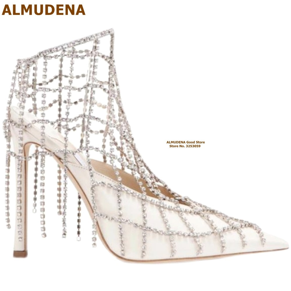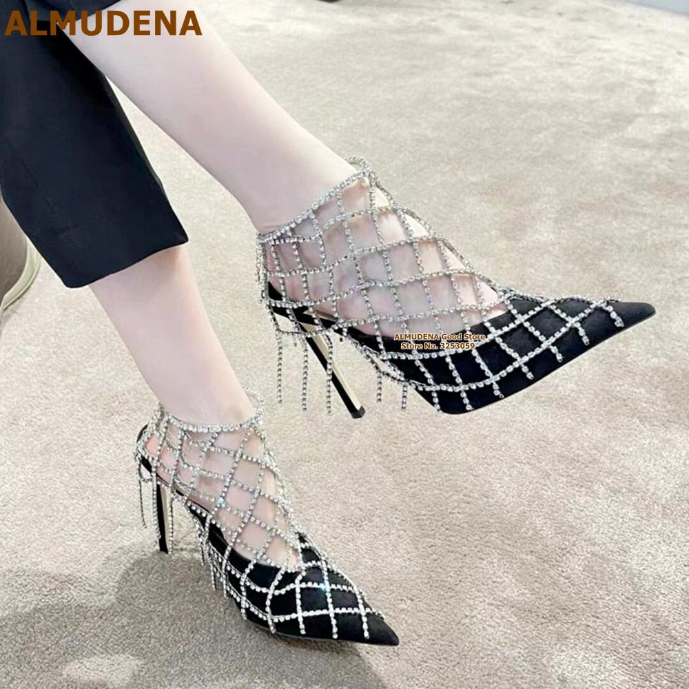 Bling Bling Crystal Net Fringe Wedding Shoes Black White Patchwork Shining Rhinestone Caged Tassel Thin Heel Pumps