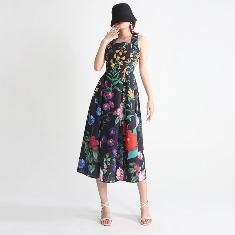 Elegant rural style suspender dress with medium waist heavy work nail bead inlaid diamond print dress