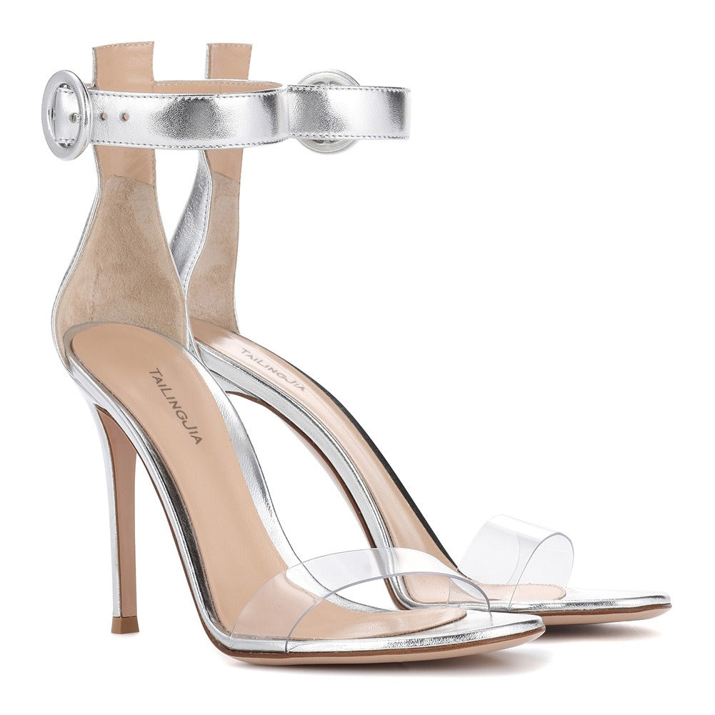 European and American Oversized Womens Shoes With Pvc Buckle and Silver Slim Heels, Elegant Sandals