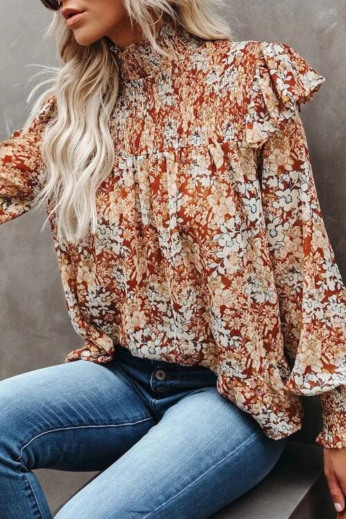 Floral Smocked Lantern Sleeve Ruffled Blouse