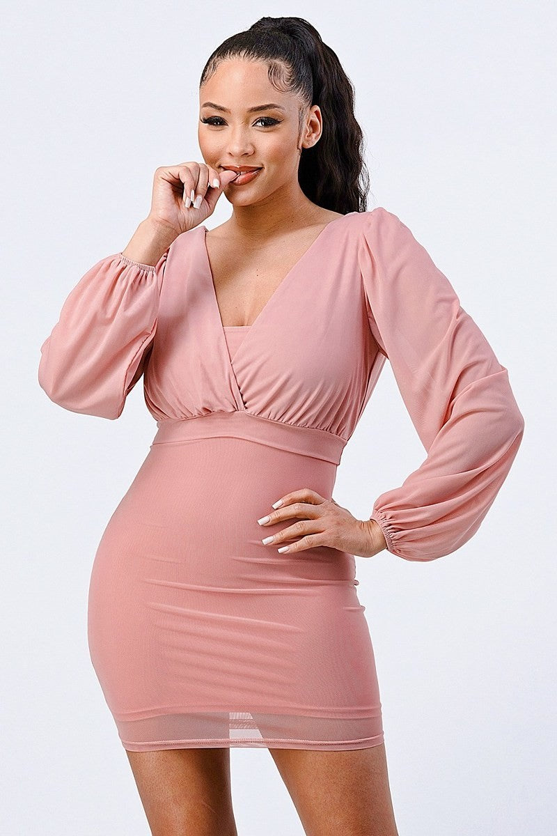 Lux Mesh Layered Lining V Neck Bubble Slv Bodycon Dress
