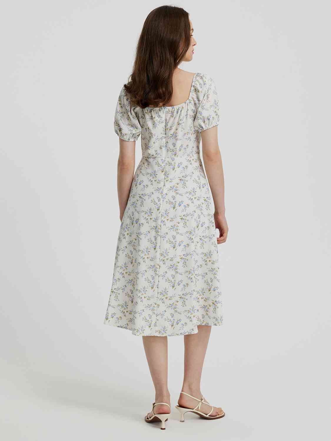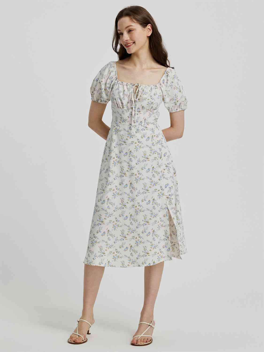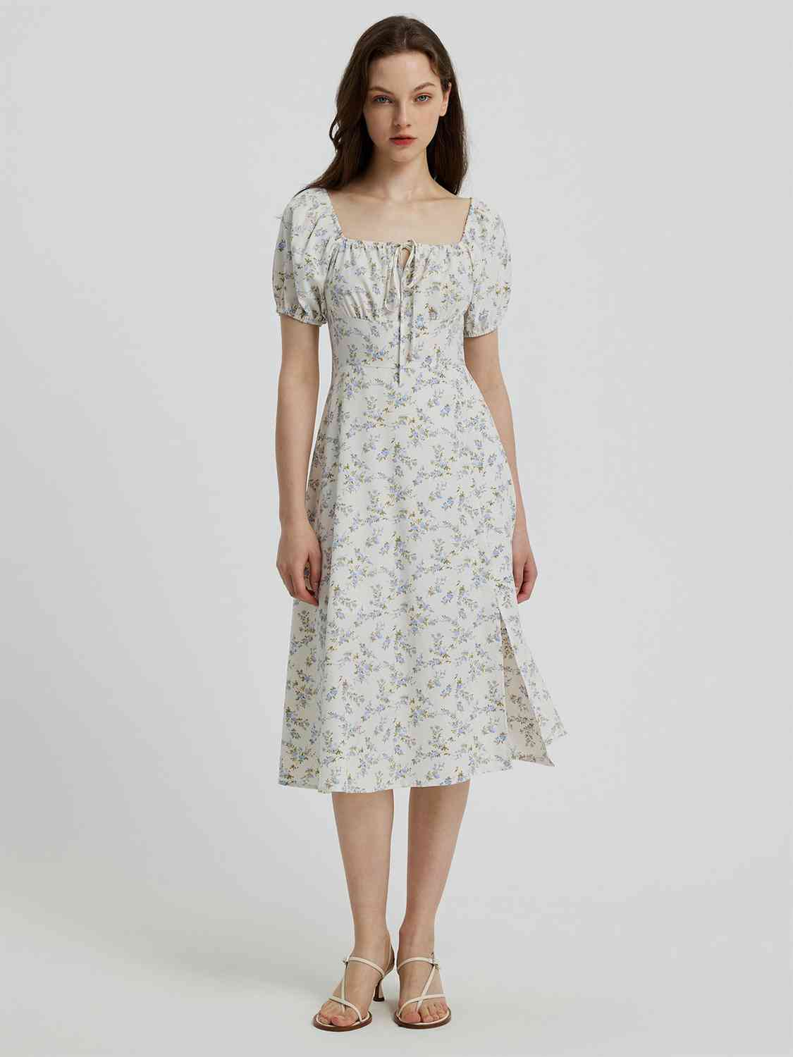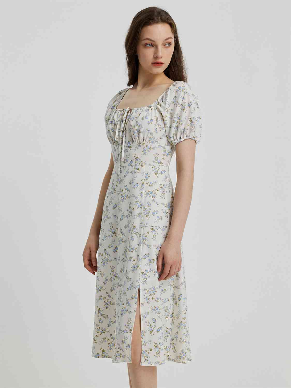 Printed Tie Front Square Neck Short Sleeve Slit Dress