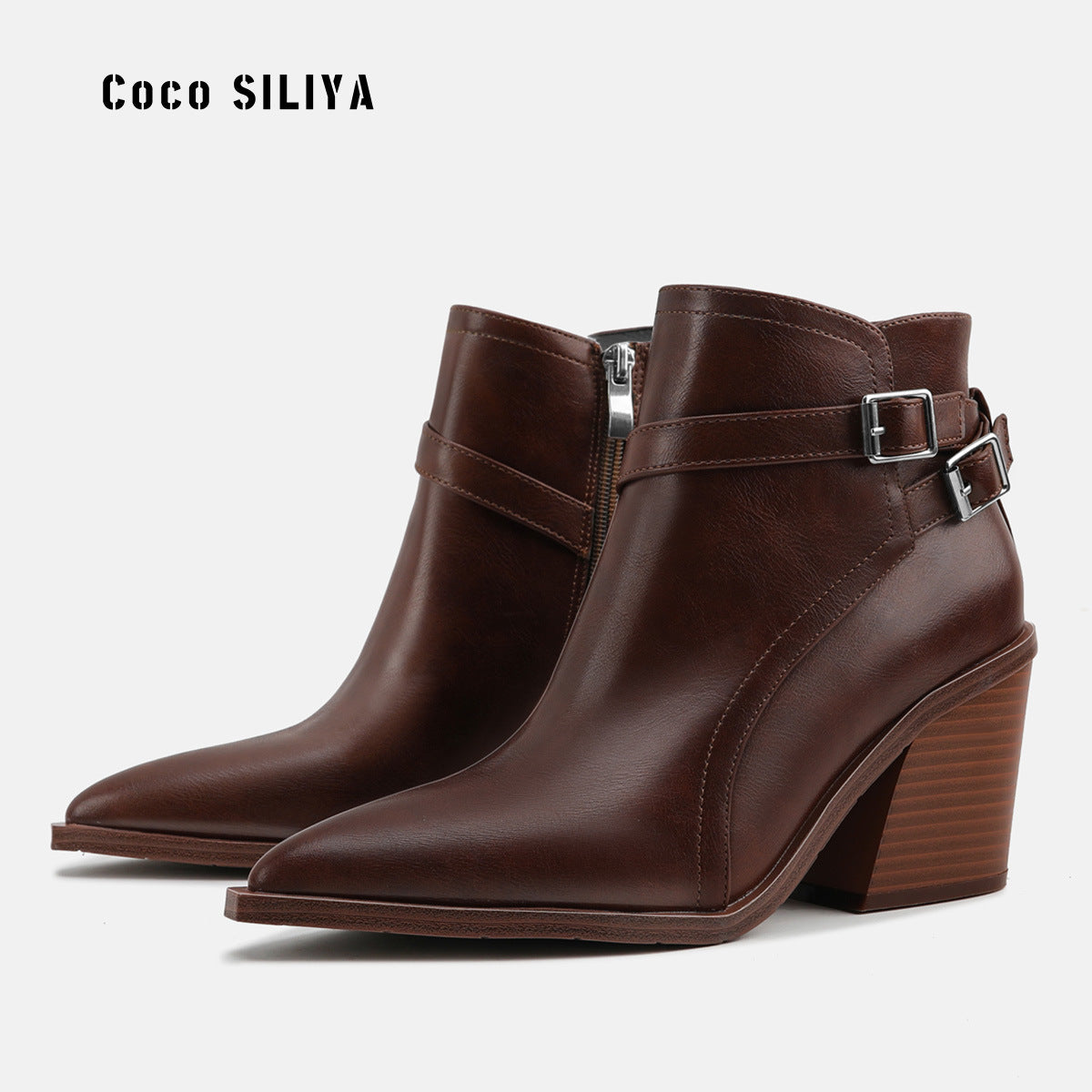 Short Boots Large Size Arrow Thick Heeled High Heeled Chelsea Female Short Boots British Style And Nude Boots