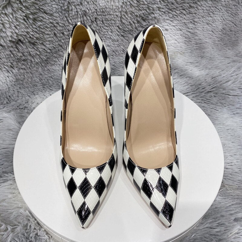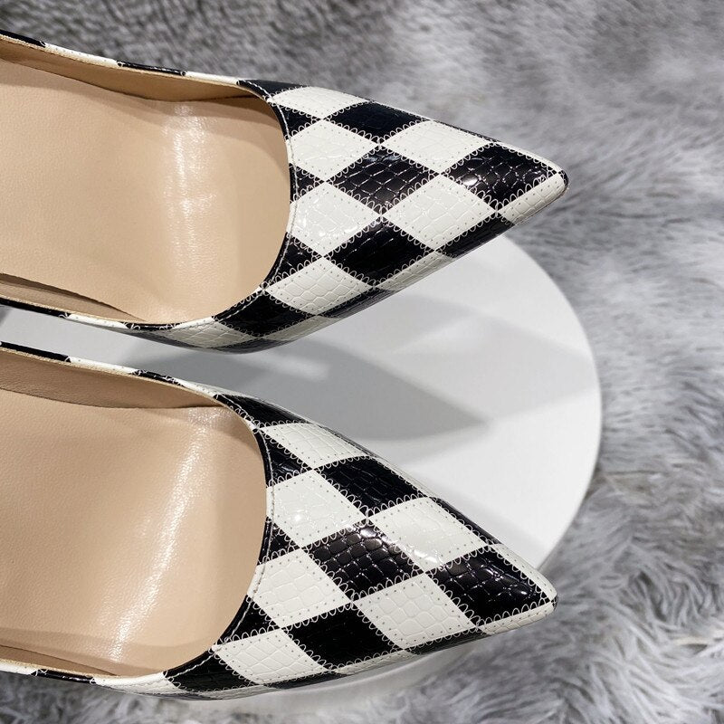 Tikicup Black White Diamond Crocodile Effect Women Pointy Toe High Heel Shoes Designer Slip On Stiletto Pumps 8cm 10cm 12cm