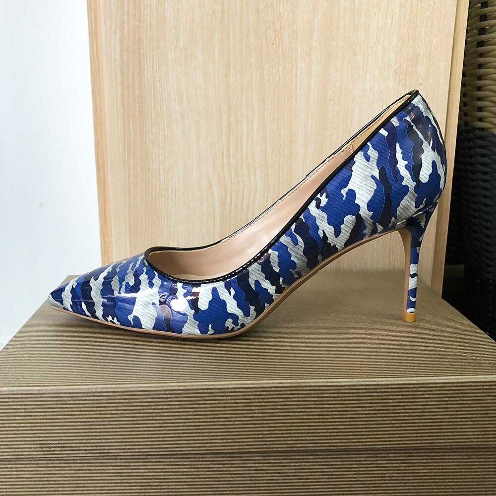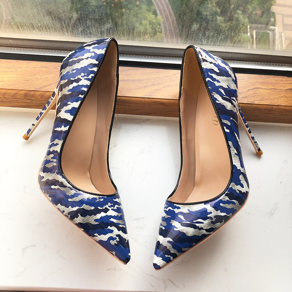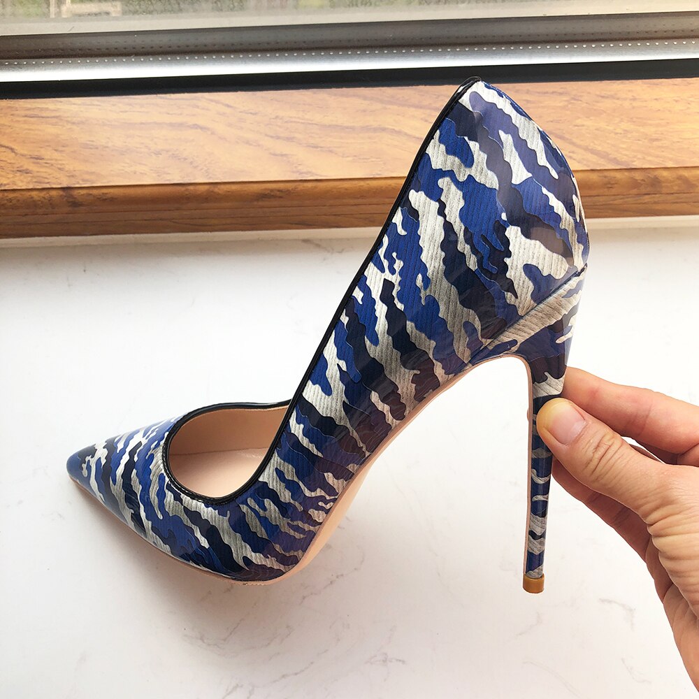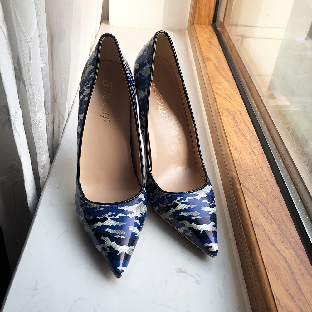 Tikicup Blue Women Patent Printed Pointy Toe High Heels 8cm 10cm 12cm Customize Ladies Chic Stiletto Pumps Slip On Dress Shoes