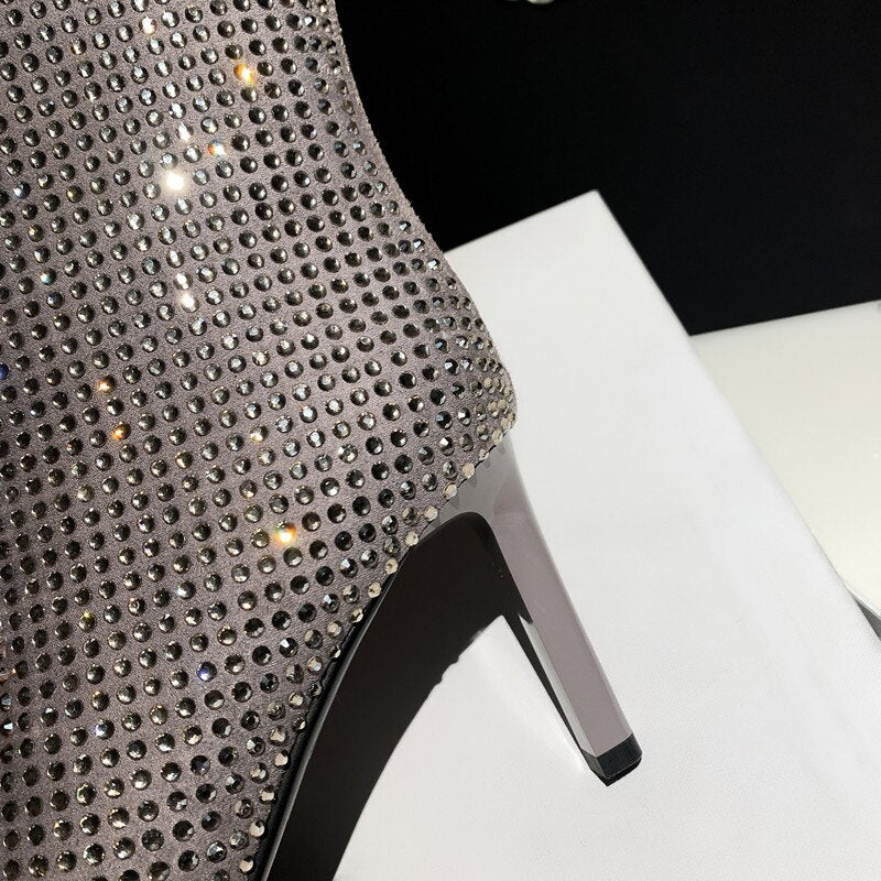 Women's Rhinestone High Heel Booties Fall New Pointed Toe Mid Boots 8.5cm High Heel Black Rhinestone Side Zipper Boots Size 39